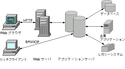 もっとも一般的なアプリケーションサーバは JavaTM アプリケーションサーバです。iPlanet Application Server は Java アプリケーションサーバで、Java 2 Enterprise Edition (J2EETM) 仕様書に完全に準拠しています。J2EE は完全で安全な基盤を提供し、セキュリティ、開発、展開、コードの再利用、移植性の標準セットが数多く記述されているので、企業は移植可能でベンダに依存しないアプリケーションを作成することができます。
