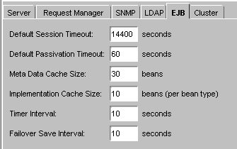 - EJB ステートを保存する頻度 (秒単位)。サーバが失敗した場合、最後に保存された EJB のステートが復元されます。保存されたデータはクラスタ内にあるすべてのエンジンからアクセスできます。この値はサーバごとに設定され、Deployment Tool EJB 記述子エディタの「一般」タブで有効にしたフェールオーバーオプションで配置された EJB に適用されます。