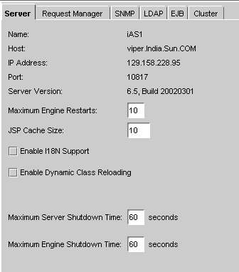 - 「サーバシャットダウン最大時間」は、iPlanet Application Server をシャットダウンする最大時間です。この時間を過ぎると、実行中のすべてのエンジンが強制終了されます。通常、負荷が大きくない限り、サーバはすぐにシャットダウンされます。