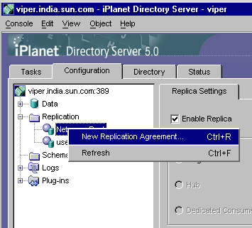 プライマリ Directory Server のコンソールで 「NetscapeRoot」>「New Replication Agreement...」を右クリックします。