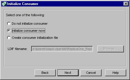 ファイルにデータを書き込む場合は、「Create consumer initialization file」を選択します。データを保存するための .ldif ファイルを選択します。このファイルはあとでバックアップ Directory Server にコピーされます。詳細は、「LDIF による Directory Server へのエントリの追加」を参照してください。