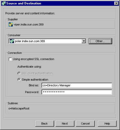 「Supplier DN」テキストフィールドに有効な識別名を入力します。たとえば、「cn=Directory Manager」のように入力します。