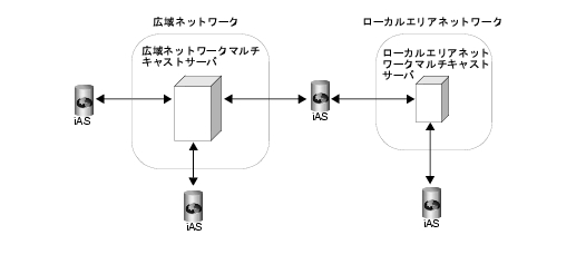 複数サーバ企業では、ロードバランスおよび管理を目的として、マルチキャスト広域ネットワーク (WAN) サービスを利用した、アプリケーションサーバ間通信が行われます。マルチキャストサービスでは、仮想サーバを介して、すべてのメッセージの送信および分散が行われます。アプリケーションサーバでは、N 方向のマルチキャスト構成を使ってブロードキャスト情報を送受信します。次の図は、このネットワークの概要を示しています。