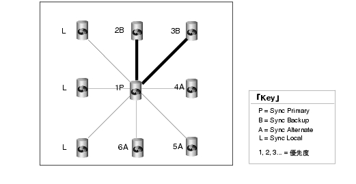 この図では、すべてのサーバが Sync Primary と通信しています。Sync Local には、優先度番号が割り当てられていません。