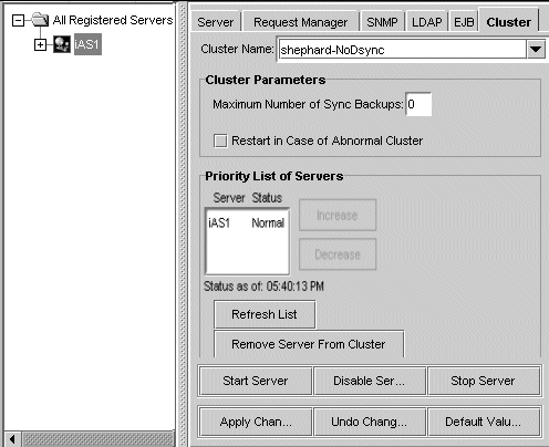 クラスタ内のすべてのサーバを再起動します。クラスタ全体に変更を適用するには、クラスタ内の各インスタンスを再起動し、すべてのインスタンス変更を認識させる必要があります、。「一般」ウィンドウの左側のペインで、変更するクラスタのメンバーである iPlanet Application Server を選択します。
