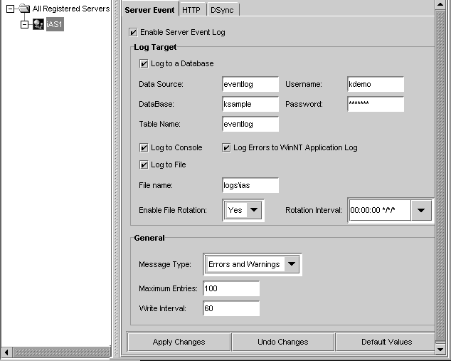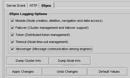 「ログ」ウィンドウの左側のペインから DSync メッセージを記録するiPlanet Application Server を選択します。