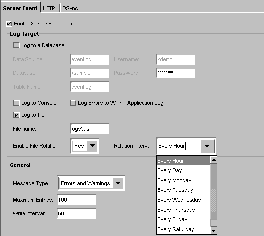 設定された期間の終了時にログファイルをローテートできます。たとえば、現在のログだけがログファイルに存在するように、ログファイルのローテーションを10日ごとまたは毎週水曜日に指定できます。ログファイルには作成された日時がスタンプされるため、ログファイルローテーションはログファイルを管理可能な単位に構成します。ASCII ファイルにあるサーバメッセージの記録を選択すると、ログファイルのローテーションを有効にしてエントリを定期的に調整できます。
