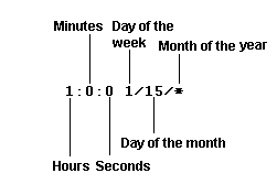 - たとえば、次の文字列は、新しいファイルへの記録が毎月 15 日と、毎週月曜日の午前 1 時に始まることを示しています。