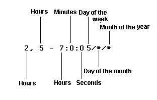 - 次の文字列は、新しいファイルへの記録が毎週金曜日の午前 2 時、午前 5 時、午前 6 時、および午前 7 時に始まることを示しています。