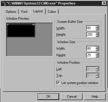 DOS ウィンドウに表示されるログメッセージは連続してスクロールします。出力ウィンドウで垂直スクロールバーを有効にすると、メッセージ表示を上下にスクロールできます。DOS ウィンドウで垂直スクロールバーを有効にするには、次の手順を実行します。
