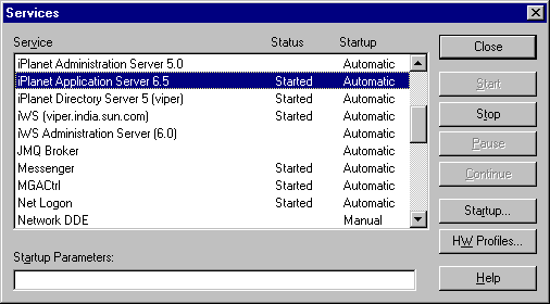 これを実行すると、DOS ウィンドウに iPlanet Application Server ログメッセージが表示されます。iPlanet Application Server の各物理プロセスは独立したウィンドウに表示されます。たとえば、KAS ログ、KJS ログ、および KCS ログを独立したウィンドウに表示できます。「サービス」アイコンをダブルクリックします。次の図のように「サービス」ウィンドウが表示されます。