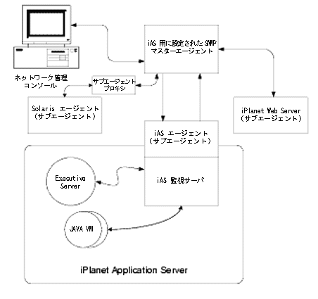 SNMP は、ネットワークの状態に関するデータの交換のために使われるプロトコルです。SNMP によって、データはアプリケーションサーバと、ネットワーク管理ソフトウェアがインストールされているワークステーションの間で移動します。ワークステーションからリモートでネットワークを監視して、サーバ間のネットワークの稼動状況に関する情報を交換できます。たとえば、HP OpenView などのアプリケーションを使って、アプリケーションサーバが受信するエラーメッセージの数やタイプのほかに、どの iPlanet Application Server マシンが実行中かを監視できます。