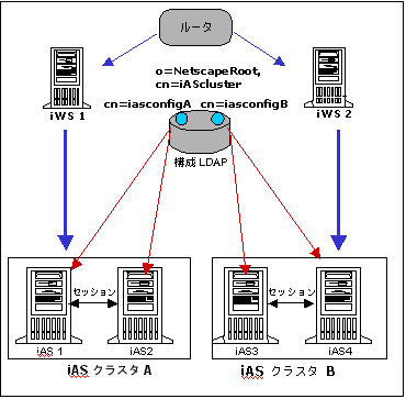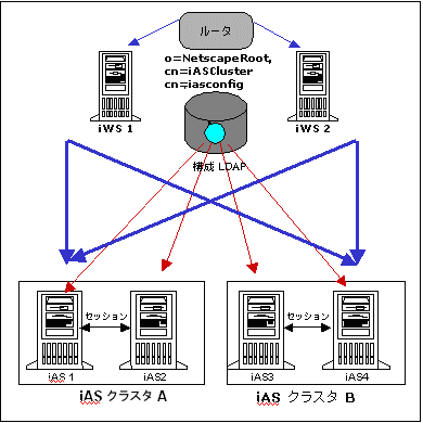 このシナリオでは、各 iPlanet Application Server クラスタの LDAP 設定ツリーに枝があります。各 iPlanet Application Server クラスタには、専用の iPlanet Web Server が少なくとも 1 つあります。リクエストが iPlanet Web Server に到着すると、iPlanet Web Server は 1 つの iPlanet Application Server クラスタしか知らないため、リクエストは常にクラスタ内の iPlanet Application Server に送信されます。ルータの役目は、個々の iPlanet Web Server 間の負荷を分散することです。