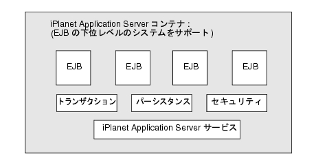 iPlanet Application Server では、EJB はアプリケーションにとって重要な役割を果たします。Servlet はアプリケーションのセントラルディスパッチャとして動作し、プレゼンテーションロジックを処理します。EJB はアプリケーションの実際のデータとルールを大量に処理しますが、ユーザインタフェースサービスを表示しません。EJB を使うと、ビジネスロジック、ルール、およびオブジェクトをスケーラブルな個別のモジュールに分割できます。各 EJB は、データ構造体やオペレーションメソッドなどの 1 つまたは複数のアプリケーションタスク、またはアプリケーションオブジェクトをカプセル化します。EJB はパラメータを受け取って戻り値を返します。EJB は常にコンテナのコンテキスト内で動作します。コンテナは、EJB とそれらを管理するサーバ間のリンクとして機能します。iPlanet Application Server ソフトウェア環境では EJB コンテナがサポートされています。このコンテナは、Sun の EJB 仕様書に規定されているすべての標準コンテナサービスに加え、iPlanet Application Server に限定されたサービスも提供します。