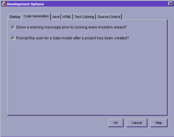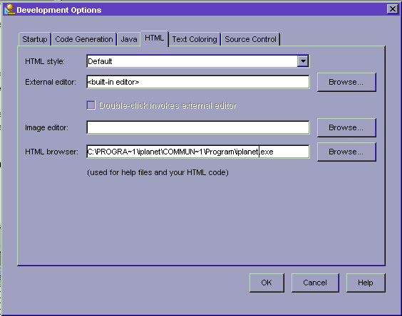 In iPlanet Application Builder, you can set options to customize your work environment. Options for the project itself are found under the Project menu on the Project Options dialog box. Project options include the ability to specify which HTML page serves as your project's start page during testing and which files will serve as the base classes in your project.You can also set options for your development environment. Options for the development environment are found under the Tools menu on the Development Options dialog box. Examples of development options include which external code editor to use with iPlanet Application Builder, if any, and which web browser to use for viewing HTML pages.