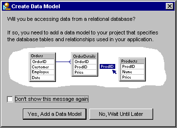 Check "Prompt the user for a data model after a project has been created?" if you want to be reminded to create a data model whenever you create a project. If checked, the following message will appear each time you choose New Project from the File menu: