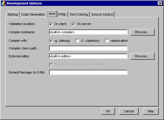 The Java tab allows you to customize the behavior of the Java compiler. For instance, you may specify an external compiler and set compiler options. To set Java compiler options, click the Java tab as shown in the following figure:
