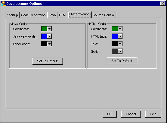 The Text Coloring tab enables you to customize the color of the code appearing in an editor window. For instance, you may specify that Java keywords within your code appear in red text. These options apply only to editors built in to iPlanet Application Builder.To set text coloring options, click the Text Coloring tab to display the following dialog box: