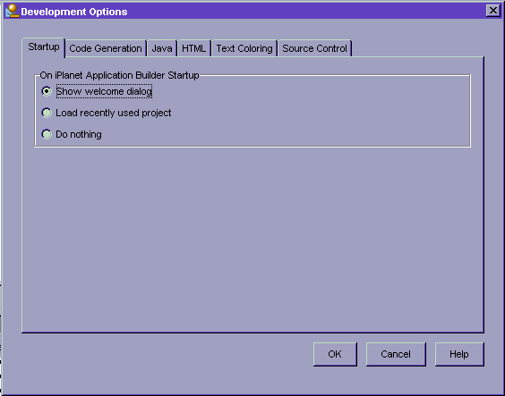If you want the Welcome dialog box to appear next time you start iPlanet Application Builder, click the Startup tab in Development Options, then select the appropriate option button as shown in the following figure: