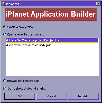 If you choose "Don't show dialog at startup," iPlanet Application Builder changes the Startup development option to "Load most recently used project," which automatically loads the last project. If you do not want either option, you can choose "Do nothing."