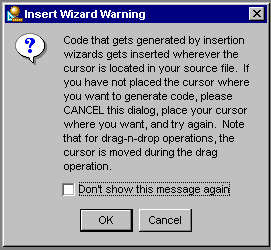 Check "Show a warning message prior to every running insertion wizard?" if you want to be reminded to set the cursor where code will be generated. If checked, the following message will appear each time you insert code using a wizard: