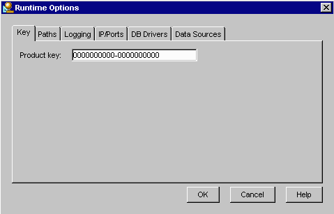 Instead of re-installing iPlanet Application Builder and supplying the new product key during installation, you can change the product key in your current installation. To do so, pull down the Tools menu. Choose Runtime Options and enter the product key in the Product Key field.
