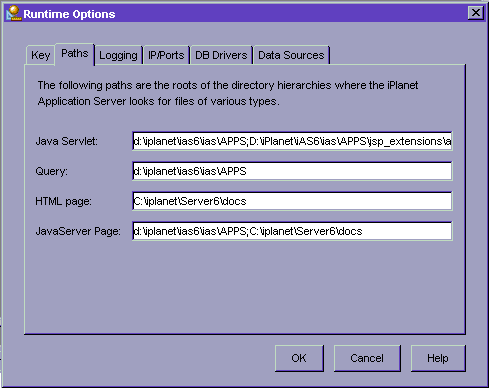 When a web application is called on to display a page or to execute code, the application looks in particular directories for the files it needs. These file path names are set by the user who installs iPlanet Application Builder. However, if the file system has been reorganized, you may need to change the path names.To change file path names, click the Paths tab to display the following dialog box: