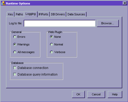 The Logging tab in iPlanet Application Builder allows you to specify the names of the log files and preferences for the kind and amount of information written to these files.