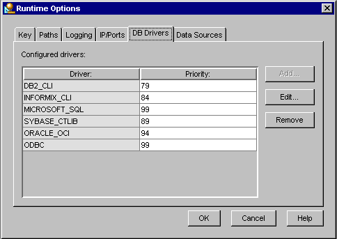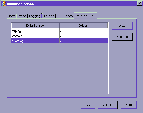 You can use the Add, Edit, or Remove buttons as needed to modify database connectivity settings. Click Help for detailed information about each option.