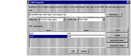 If this link is in an HTML page, you can bind any part of the URL to dynamic data from a servlet by clicking the associated Data-Bind button. Create a data-binding expression using the resulting dialog box as described in Editing Complex Data Expressions.