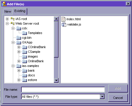 In iPlanet Application Builder, display the Add Files dialog box by pulling down the Project menu and choosing Add Files. You can also choose New then Files from the File menu and select the Existing tab.Copy other files (queries, data models, Java source, Java Server Pages) to your project root.