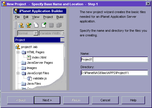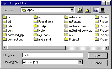 The wizard also creates a project.iab file, which contains information about the files in a project and other information used by the iPlanet Application Builder and the Application Server. This .iab file is the file that you choose when you open an existing project.