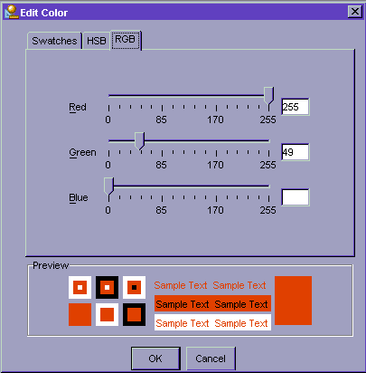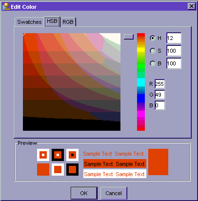 Some properties indicate a color, which must be specified using either RGB (a hexadecimal number representing a combination of red, green, and blue) or HSB (a number representing hue, saturation, and value).You can edit color properties by specifying HSB values. The custom color editor helps you choose colors using either method. Click the tab corresponding with the method you prefer. When specify a color in one mode, the other mode is updated. In both tabs, the selected color is shown in the rectangle on the bottom right.