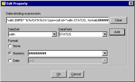 A RowSet/RowField combination yields one column of data from a query. You can provide more than one column of data in a given data-binding, however, by using a custom-built data expression that states which RowSets and RowFields appear in the single display.To use a custom property editor to create a complex data expression, click the custom property editor button
