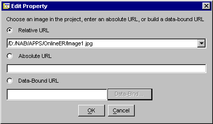 If this image is in an HTML template, you can determine the URL with dynamic data from a servlet by clicking the Data-Bound URL radio button and then clicking the associated Data-Bind button. Create a data-binding expression using the resulting dialog box as described in Editing Complex Data Expressions.