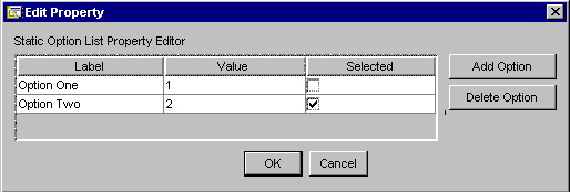 Set up list items by creating name/value pairs. If you want an item to be selected by default at runtime, click the Selected checkbox for that option. To add or delete an item, click the appropriate button on the right. When you are finished editing list items, click OK, or click Cancel to abandon changes.