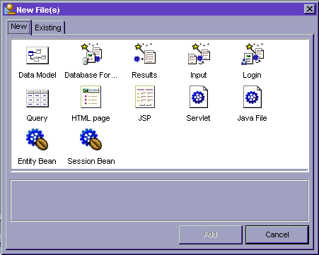 To create files, either double-click an icon, or select an icon and click Add. You can use the New Files dialog box to create the following individual files: