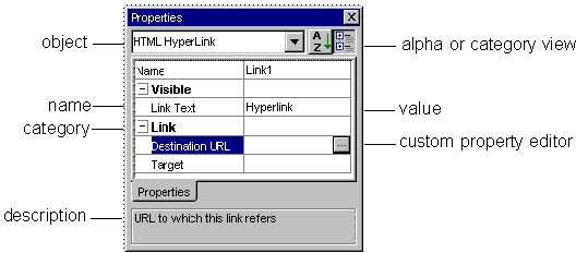 View and edit properties by using the Properties window.The object whose properties are being displayed appears in the top drop-down box. Property names appear in the left column, and their corresponding values appear in the right column. When a property is selected, its description appears in the description box at the bottom of the window.
