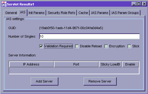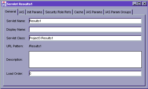 The Properties editor for a servlet specifies properties that are set when you create the servlet via a wizard. You can change the initial parameters, caching information, validation parameters, through the project meta editor. For more information about these properties, see the Programmer's Guide.