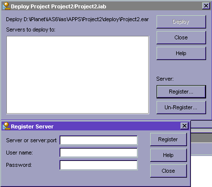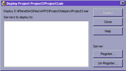 - To deploy to one or more servers, you must register the server machine with iPlanet Application Builder. If the server does not appear in the Registered Servers list, click Register. The following dialog box appears: