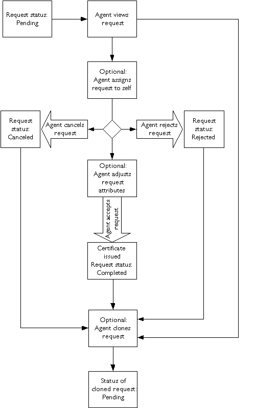As an agent, you can approve a certificate request. If the request was made directly to the Certificate Manager, it issues the certificate; if the request was made through a Registration Manager, the Registration Manager passes the approved request on to the Certificate Manager for issuance. Before approving a request, you can assign it to yourself, adjust the attributes of the request, and verify that it will result in a valid certificate. To do these things, use the Request Details form that appears when you examine a selected request (as described in "Selecting a Request"). If you want to reject or cancel the request, see "Other Options for Handling Requests."The approval and issuing process has the following stages: