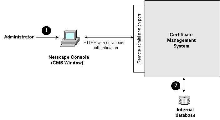 When an administrator makes an administrative request to Certificate Management System (from the CMS window within Netscape Console or from any command-line tool), the server needs to authenticate the administrator before processing the request. To facilitate this, Certificate Management System supports an authentication method that includes user ID- and password-based authentication from the client and SSL server authentication from the server.Certificate Management System identifies and authenticates users with administrator privileges by checking their user IDs and passwords in its internal database. These are the user IDs and passwords you entered in the internal database when you created these user entries. For details, see "Setting Up Administrators".