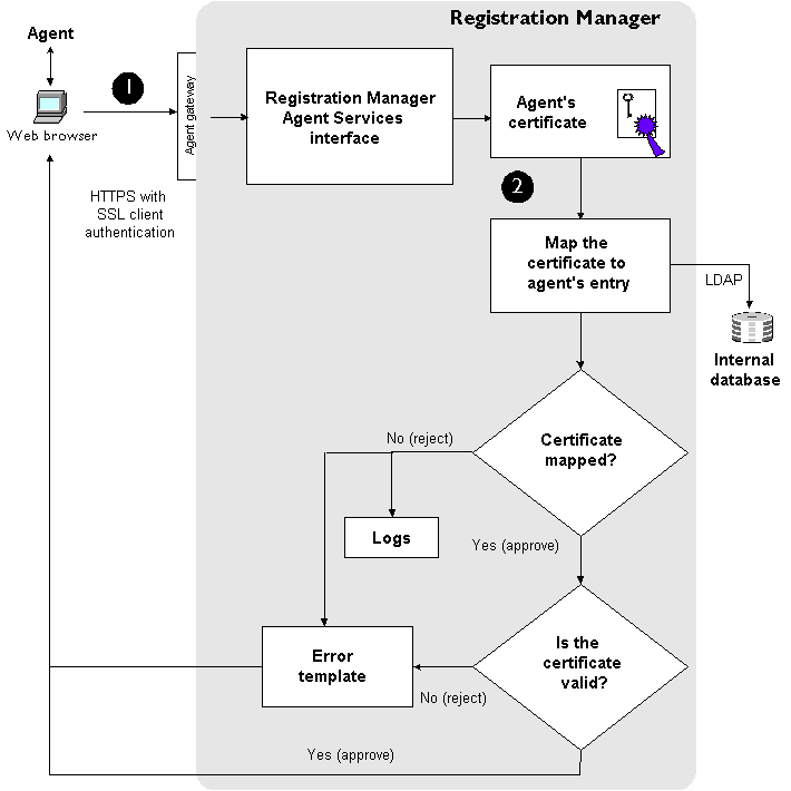 An agent opens a web browser and enters the URL to the Registration Manager Agent Services interface hosted by the Registration Manager. The server requests the client for SSL client authentication. The client in turn prompts the agent to specify the certificate that it should present to the server for authentication. The successfully SSL client authenticated certificate is presented to the Registration Manager.