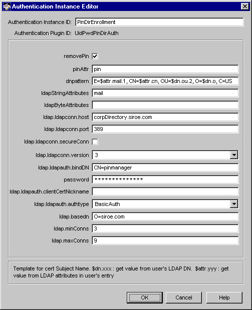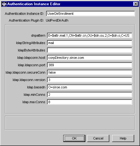 - The Configure Authentication Instance Parameters window appears, showing the current configuration of this instance.