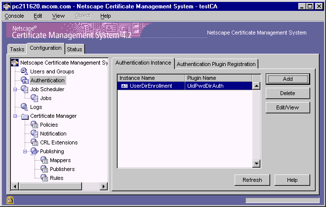 You can delete an authentication instance that you no longer need from the CMS configuration. If you delete an authentication instance, end users will fail to enroll for certificates using the associated enrollment form. If you want the form to work with another authentication instance, you must make the appropriate changes to the form; see "Step 5. Set Up the Enrollment Interface".To delete an authentication instance from the CMS configuration: