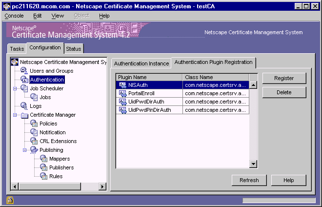 You can register custom authentication plug-in modules from the CMS window. Registering a new authentication module involves specifying the name of the module and the full name of the Java class that implements the authentication interface. For example, you can add a Java class, named as follows, that implements an authentication module:com.netscape.certsrv.authentication.ssnAuth