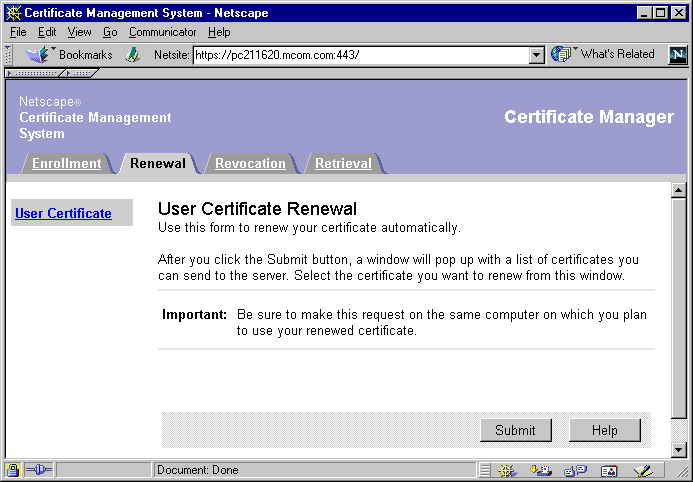 The End Entity Services interface of the Certificate Manager and Registration Manager includes a default HTML form for renewing end users' certificates. The form is accessible from the Renewal tab as shown in Figure 15-3.