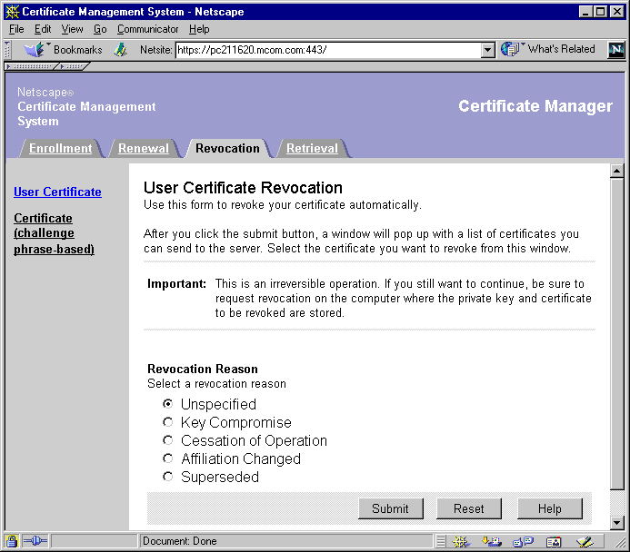 Forms for both methods are available through the End Entity Services interface (HTTPS only) of the Certificate Manager and Registration Manager; see "Certificate Revocation Forms".