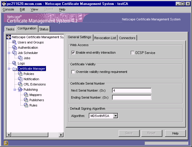 In the Default Signing Algorithm section, select the signing algorithm the Certificate Manager should use for signing certificates. The choices are "MD2 with RSA," "MD5 with RSA," and "SHA1 with RSA," if the CA's signing key type is RSA and "SHA1 with DSA," if the CA's signing key type is DSA.