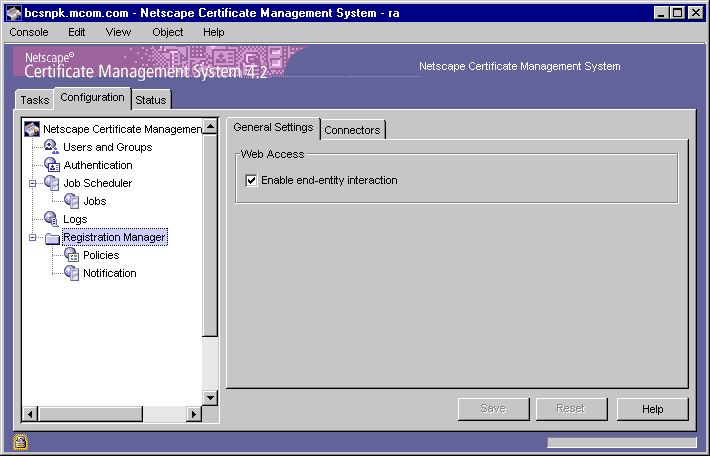 In the Web Access section, check the "Enable end-entity interaction" option if you want end entities to be able to interact with the selected Registration Manager via the HTTPS port; leave it unchecked to disable end-entity interaction with the server.